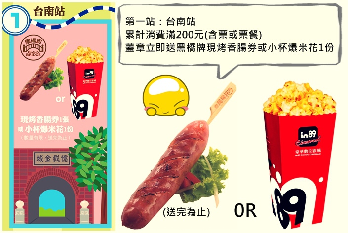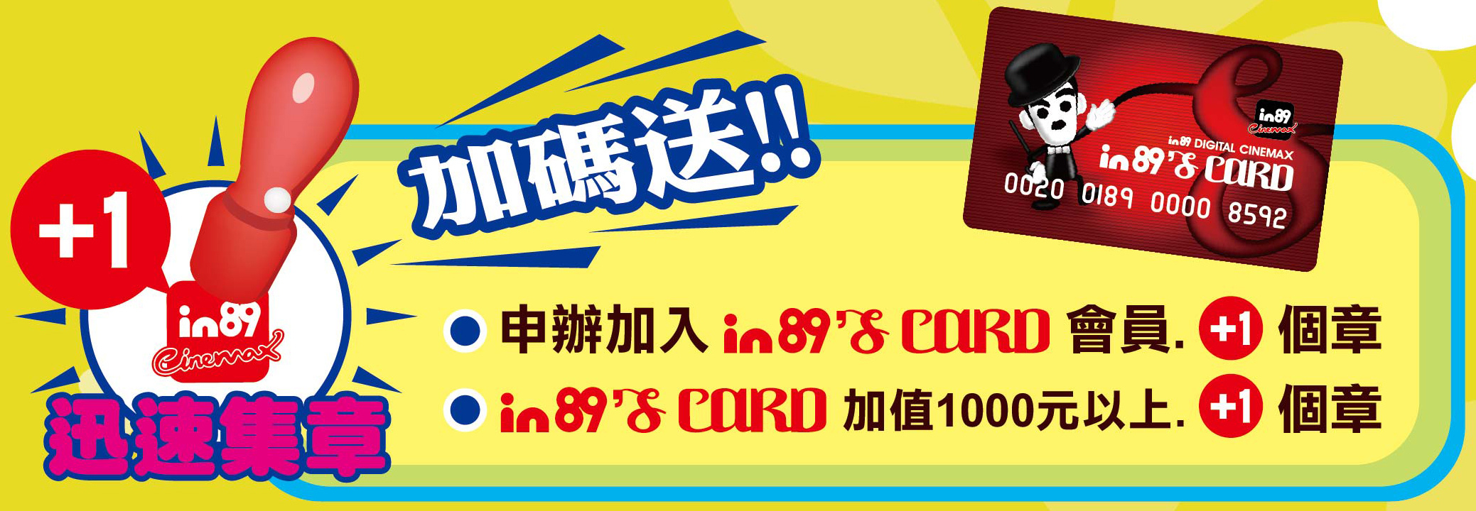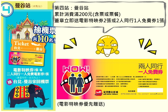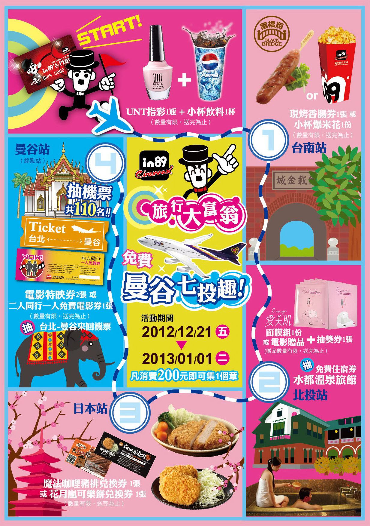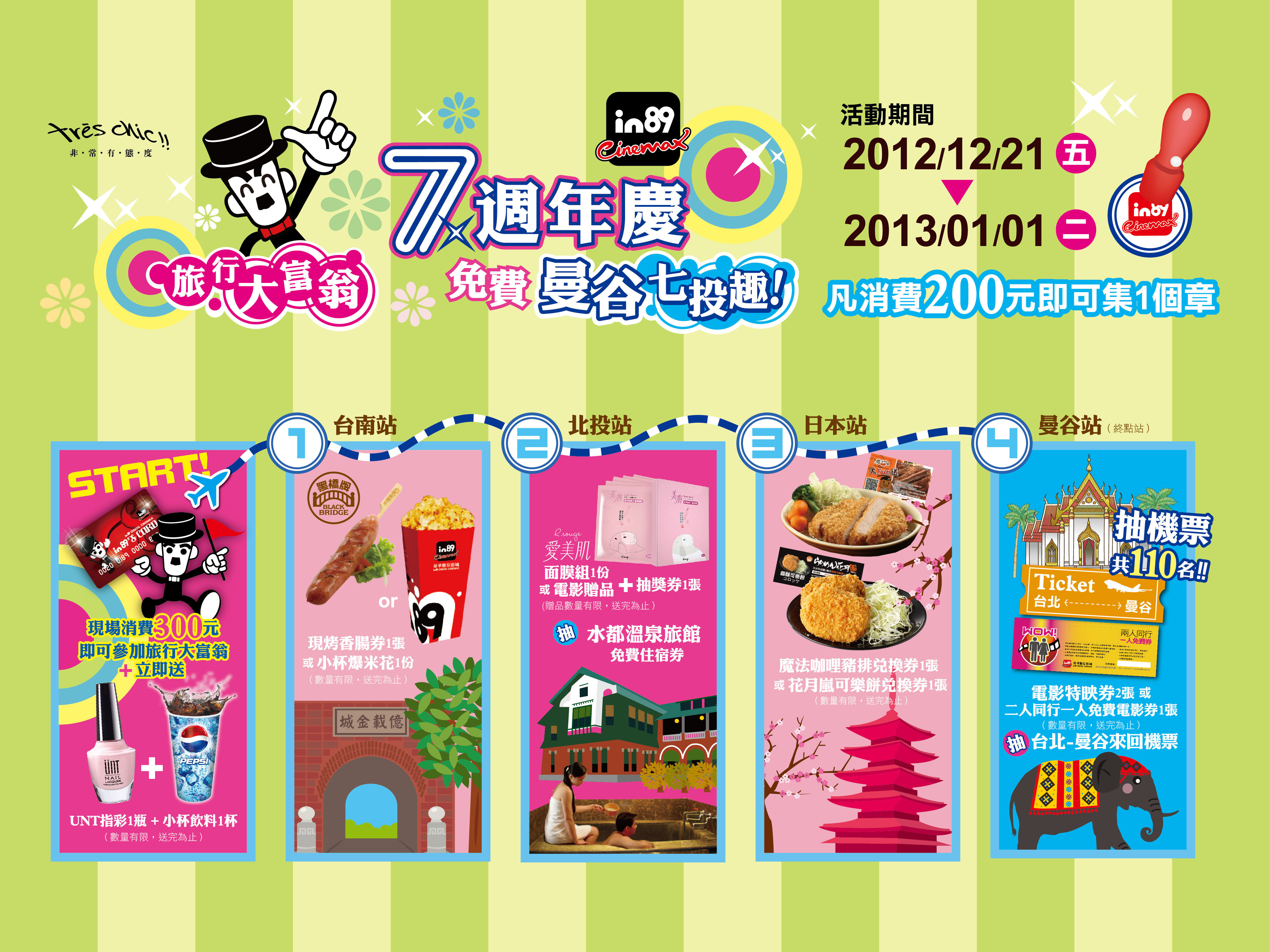 in89豪華數位影城七週年慶,一起七投旅行大富翁,免費曼谷七投趣。活動期間至現場消費300元即可參加旅行大富翁集章遊戲,之後累計消費每200元即可集1個章,每蓋完1個章即可獲得該格的贈品,最高送價值1500以上贈品,集滿4個章即可抽110張台北-曼谷來回機票!