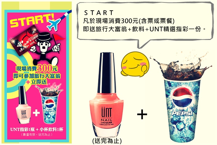 集滿2個章再抽水都溫泉會館住宿券、水都溫泉會館2hr客房泡湯券、百事可樂旅行箱、百事可樂旅行後背包等大獎。