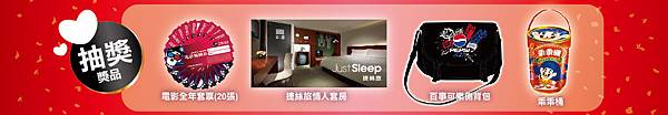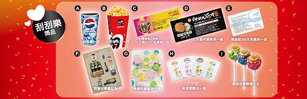 獎品包含:加倍佳棒棒糖、小飲兌換券、小爆兌換券、2人同行1人免費券兌換券、百事可樂復古筆記本、花月嵐可樂餅券、r.rouge保濕精露包、純攪和體驗香皂、捷絲旅300元折價券。