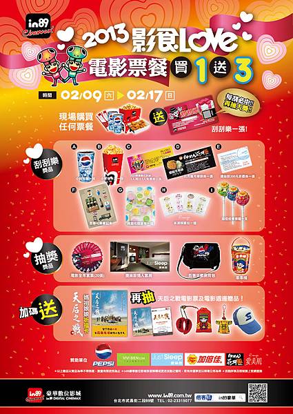 結合今年度春節與西洋情人節,延續MIT影食新潮流計畫,in89推出2013影食LOVE活動,除代表“愛影食”之外也意味著“in是LOVE”的概念♥